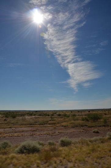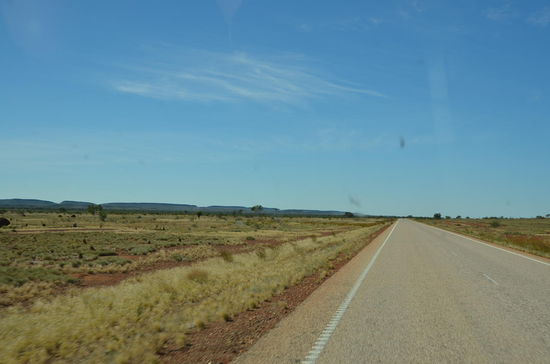 Die letzten 290 Kilometer fährt Jürg. Die Gegend wird immer interessanter. Eine flache Baum-Savanne lässt uns weit ins Outback blicken. Wir sehen am Horizont immer wieder dunkle Rauchwolken und Schilder warnen des öftern vor Steppenbränden. Der starke Wind lässt auch Sandtornados entstehen, die munter über grosse Sandflächen wirbeln. Ab und zu erblicken wir grosse Flugzeuge, die einsame Kondenssteifen am Himmel entstehen lassen, welche der Wind dann langsam zerfleddert.