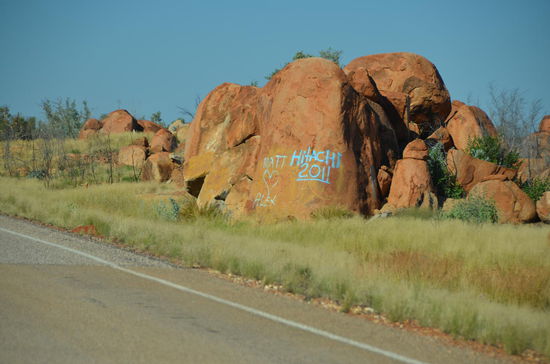 Nun, der Höhepunkt meiner Aufmerksamkeit ist ein kleines totes Känguru am Rande der Strasse. Als ich es überholen will, kommt mir plötzlich ein Auto an einer unübersichtlichen Strecke entgegen und ... der arme Kerl wird ein zweites Mal überfahren. Oi... das gefällt Jürg gar nicht und ich komme in den Genuss einer Standpauke. Meine Beteuerungen, dass ich rechts wegen dem Auto und links wegen dem hohen Asphaltabsatz nicht anders konnte, wird nur widerwillig zur Kenntnis genommen. Also herrscht im Camper etwas Eiszeit, was bei der Hitze draussen nicht so tragisch ist...