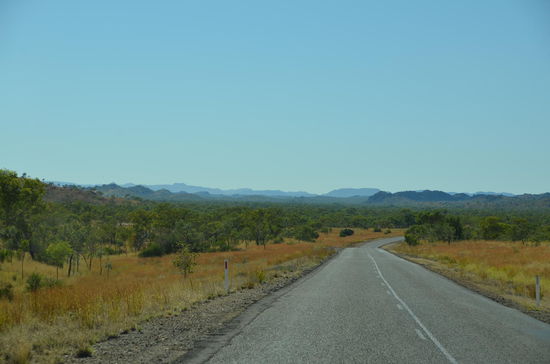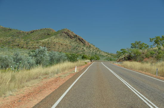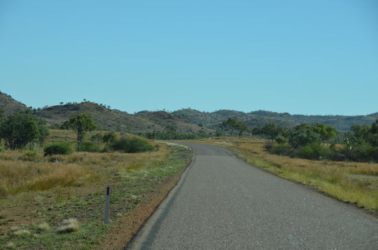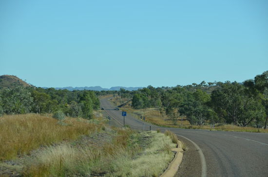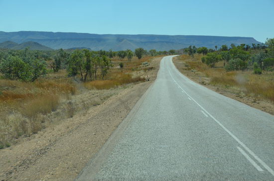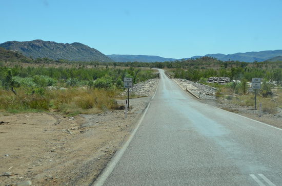 In einem Roadhouse wechseln wir nach 180 Kilometern den Platz. Das Roadhouse ist ein richtiger Einkaufsort für Outback-Touristen. Es stehen viele Allrad-Fahrzeuge draussen und die Leute füllen Tank und Proviant. Auch wir geniessen hier eine Tasse Kaffe, dann gehts weiter. Langsam verlassen wir die Hochplateaus und der Highway schraubt sich wieder in tiefere Gefilde. Des öftern überqueren wir auch Flüsse, die Wasser führen. Langsam gelangen wir wieder in grössere Ebenen hinein, die am Horizont von wüstenhaften Gebirgen eingerahmt werden. Es ist die schönste Fahrt unserer Ferien!
