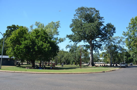 Zuerst tanken wir auf, dann suchen wir Triple J, unseren Organisator für den morgigen Ausflug. Doch trotz kleinem Plan finden wir den Laden nicht. Also fahren wir ins Städtchen hinein zum Visitor Center. Sie erklären uns noch einmal, wo Triple J ist. Auf der anderen Seite befindet sich ein Einkaufszentrum, so dass wir unsere Einkäufe erledigen. Gleich neben dem Shoppingcenter befindet sich ein Park mit einem alten Baumbestand. Überall sitzen Aborigines in Gruppen herum, betrinken sich oder machen gar nichts. Auch im Einkaufszentrum hat es ein paar Aborigines. Einer torkelt ziemlich betrunken herum und spricht Leute an. Vermutlich braucht er Geld. Es ist ein trauriger Anblick!