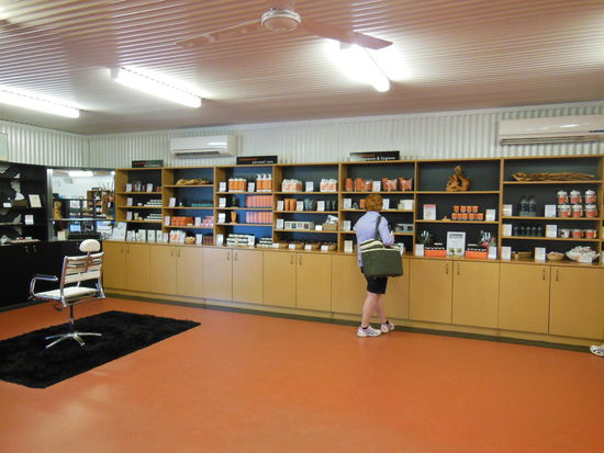 Im Innern finden wir einen tollen Shop, ein Café und ein kleines Kino. Dort werden wir zuerst über die Bedeutung und die Verwendung von Sandlewood informiert. Seit 1999 werden hier Sandelwoodbäume gepflanzt und ab 2012 kann man die ersten Bäume ernten. Echtes Sandelwood-Öl ist eine Kostbarkeit und wird vorwiegend in Indien hergestellt. Leider werden auch illegal viele Tropenbäume für dieses Öl gefällt. 80 % aller Parfums enthalten Sandlewood, aber auch in Make Up und in der Medizin findet der Stoff Anwendung. Aber nicht in jedem Produkt ist echtes Öl. Sandlewood ist nämlich auch der am meisten gefälschte Holzduft.
