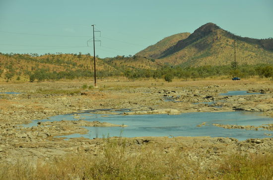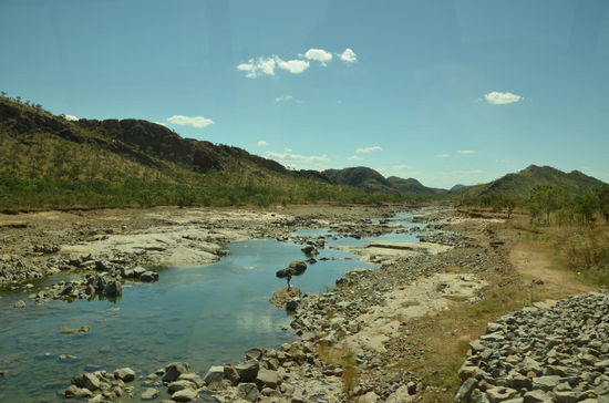 An einem Fluss, der am Austrocknen ist, gibt es einen Halt. Der Chauffeur erklärt uns, dass dies einer der Abläufe des Lake Argyle sei. Wenn der See all zu voll wird, werden Abläufe wie diese geöffnet, so dass die Staumauer entlastet wird und das Wasser weiter unten wieder in den Ord River fliessen kann. Die letzte "Entlastung" sei so heftig gewesen, dass es die Brücke, die wir danach befahren, gleich mitgerissen habe.