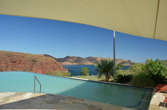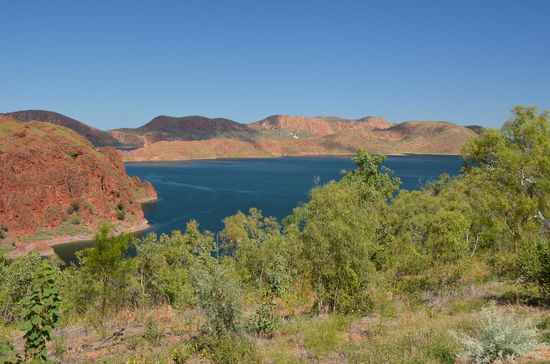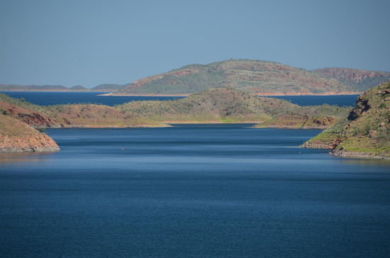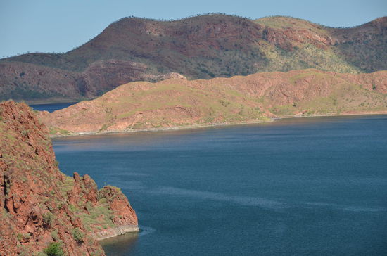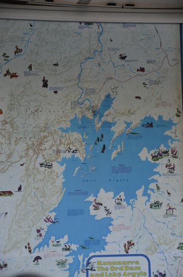 Die Fahrt geht weiter zum Lake Argyle Village, wo sich ein Campingplatz und ein Motel mit Restaurant befindet. Wir befinden uns weit oberhalb des See's. Es hat wunderschöne Aussichtspunkte, die uns wunderbare Ausblicke auf stahlblaues Wasser und wüstenhafte Berge bieten. Noch viel eindrücklicher ist die Tatsache, dass wir von hier aus nur 0,5 % der Fläche des Sees sehen, denn die Fakten des Stausees sind echt atemberaubend: