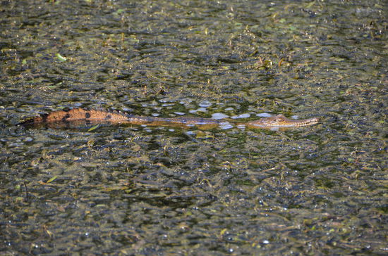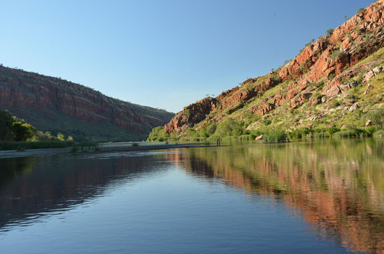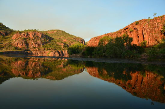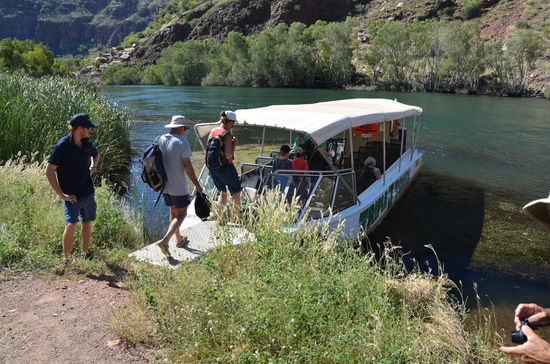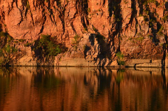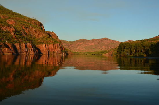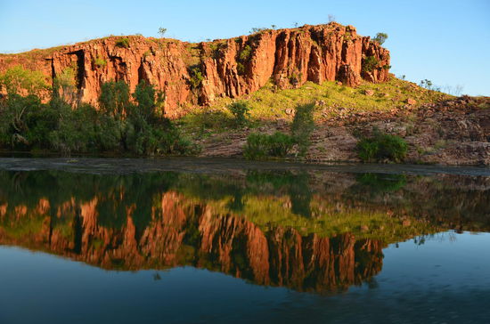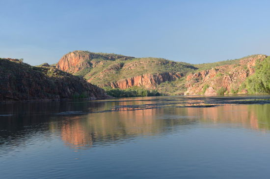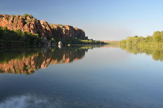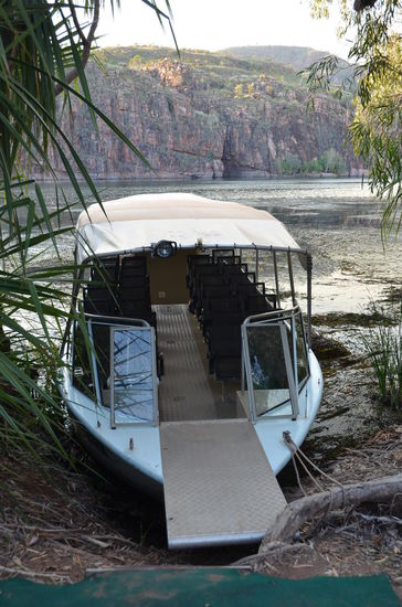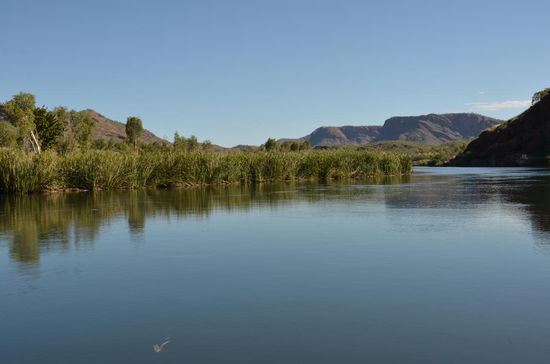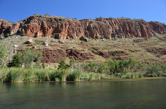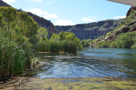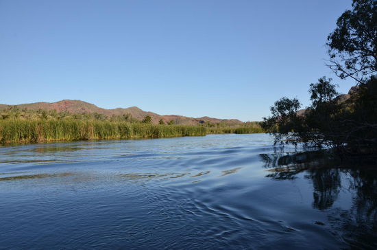 Der Ord River entspringt auf 531 Meter über Meer im Mount Wells und fliesst 651 Kilometer bis in die Timorsee. Wir lernen heute rund 50 Kilometer davon kennen. Die Fahrt führt wunderbar durch rote Sandsteinberge. Durch das Wasser bilden sich grüne Täler. Da die Fliessgeschwindigkeit nicht sehr hoch ist, bilden sich am Rande sumpfartige Gebiete, die von vielen Tieren bewohnt werden. Immer wieder macht unser Kapitän einen Halt und wir sehen viele Wasservögel und kleinere Krokis, meist Jungtiere.