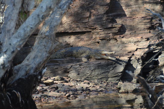 Bevor wir hinunter an den Ord River fahren, kaufen wir uns im Shop noch ein Eis. Bei dieser Hitze eine willkommene Abkühlung! Dann gehts kurvig hinunter ans Wasser und über den Erdstaudamm zum Ord River. Dort werden wir bereits von einem schönen Boot mit einem jungen Kapitän erwartet. Zuerst tümpeln wir auf diesem Flussteil gleich unterhalb des Staudamms. Unser Kapitän zeigt uns mehrere Süsswasserkrokodile oder wie man hier sagt "Freshis". Die Tiere sind in den Felsen so gut getarnt, dass man ziemlich lange und intensiv schauen muss, bis man sie sieht.