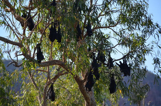 Bei einem riesigen Baum gibt es einen weiteren Halt. Am Baum hängen kopfüber eine ganze Familie von "flying fox bats" oder wie wir es nennen: riesige Fledermäuse. Da es sehr heiss ist, sucht unser Kapitän einen schattigen Platz zum Andocken. Dort gibt es Erfrischungen und eine Lehrstunde. Wir lernen alles über den Ord River, die Stauung 1971 und was es für die Region für Konsequenzen hatte. Im Winter trocknete der Ord River aus und im Sommer überflutete er alles. Mit dem Damm entstand ein Fluss, der immer Wasser führte und eine landwirtschaftliche Nutzung erlaubte. So entstand Kununurra mit der ganzen Infrastruktur.