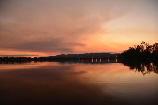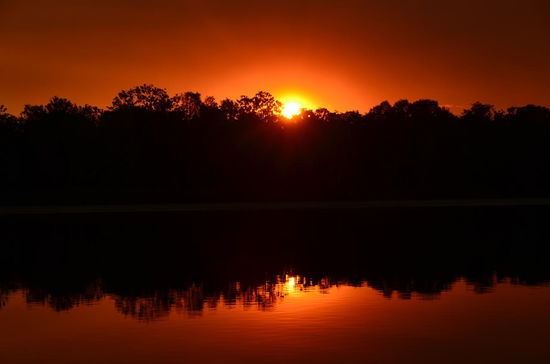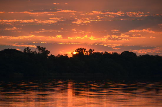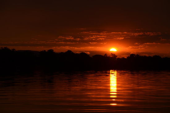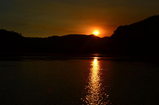 Der letzte Teil der Fahrt wird noch viel traumhafter. Einerseits spiegelt das ruhige Wasser die umliegenden roten Felsen in voller Pracht, andererseits lässt die langsam untergehende Sonne die Felsen wie Feuer aufleuchten. Doch der Höhepunkt ist der Sonnenuntergang. Eine tiefrote Kugel, durch einzelne Wolkenbänke durchbrochen, schiebt sich hinter schwarzen Bäumen dem Horizont zu. Wie ein vergoldeter Strahl leuchtet sie über das Wasser. Es ist einfach nur traumhaft.