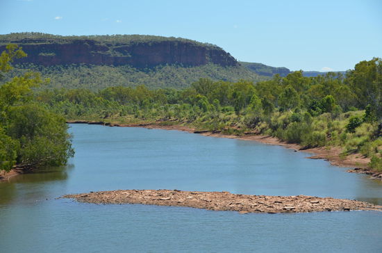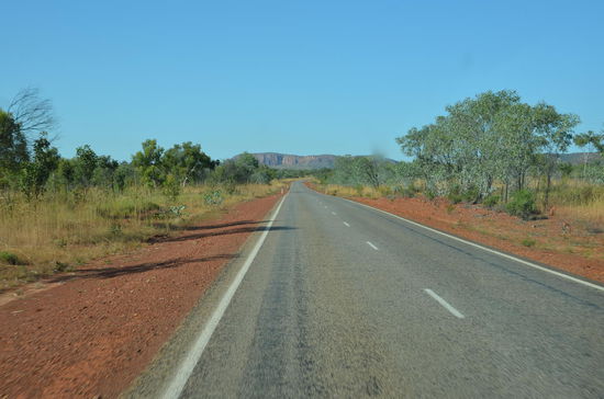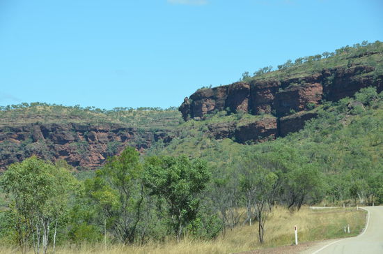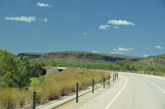 Die Fahrt ist recht ereignislos und führt durch weite Ebenen, die aber auch von Gebirgen gesäumt sind. Malerisch wird es als wir den grossen Victoria River überqueren und in den Gregory Nationalpark gelangen. Wir fühlen uns wie auf dem Colorado Hochplateau als wir kurvig die schönen roten Gebirge durchqueren. Immer wieder erblicken wir zu unserer Linken eine Kurve des Victoria Rivers. Hier ist auch der offizielle Übergang in die tropische Zone Australiens.