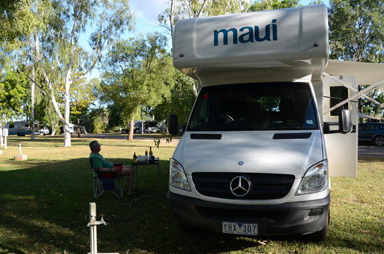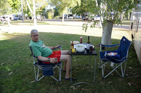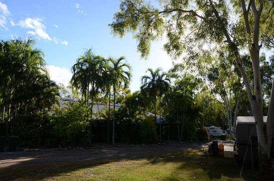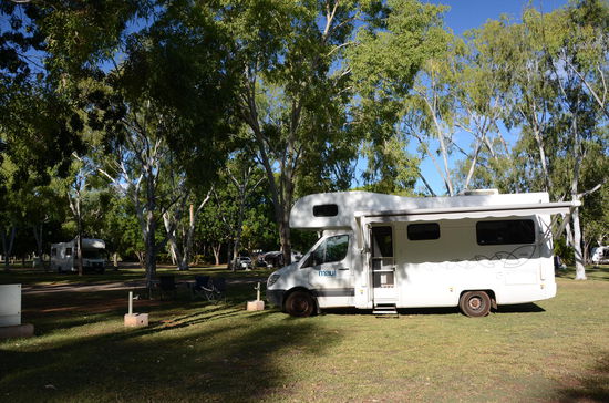 Gegenüber vom Einkaufszentrum tanken wir noch unseren Camper auf. Auch dort hat es viele Aborigines. Drei jüngere Frauen sind völlig betrunken und pöbeln im Laden herum. Wir sind schockiert und froh, dass wir Katherine verlassen können. Unser Big4-Campingplatz liegt rund 5 Kilometer ausserhalb der Stadt in einer herrlich grünen Umgebung. Wir erhalten einen schönen Standplatz unter teilweise schattenspendenden hohen Bäumen. Es ist unglaublich heiss hier! Und die tropische Feuchtigkeit macht mir zusätzlich zu schaffen.