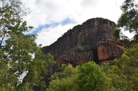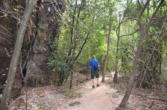 Nach ein paar Kilometern biegen wir auf die Seitenstrasse zum Nourlangie Rock ab. Die Wälder werden dichter und plötzlich entdecken wir hohe Felsen. Die Strasse endet hier auf einem grossen Parkplatz. Es hat nicht viele Autos. Bevor wir den Camper verlassen crèmen wir uns dick mit Sonnencrème und Mückenschutz ein. Es ist ungefähr elf Uhr und die Hitze nimmt zu und zu. Auch die Luftfeuchtigkeit ist beeindruckend hoch und macht das Atmen schwer. Doch wir sind ja nun schon eine Weile in der Hitze und wollen uns von einer Wanderung nicht abbringen lassen.