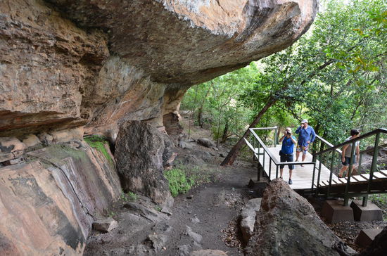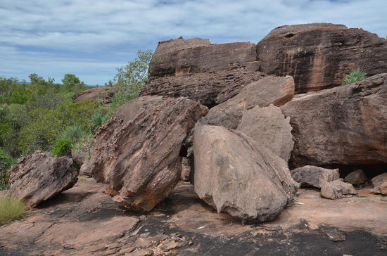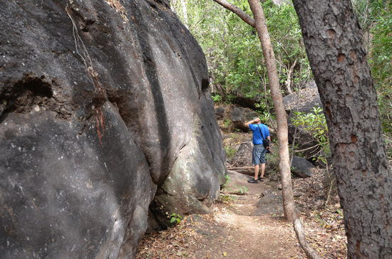Schilder weisen uns den Weg zu den berühmten Felsmalereien. Doch der Wanderweg entpuppt sich als schmaler Weg durch Gestrüpp, welcher steil in die Felsen hinauf führt. Bei all dem Giftgetier, das hier rumkriecht, klettern wir ziemlich mutig durch all die Büsche und Felsen. Zu Beginn unserer ersten Ferien 2011 in Australien wäre das undenkbar gewesen. Da wäre ich lieber auf der Stelle tot umgefallen...