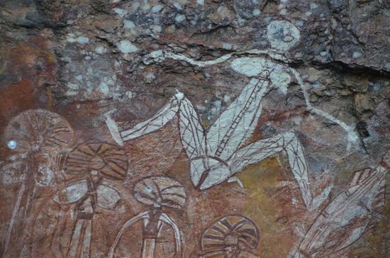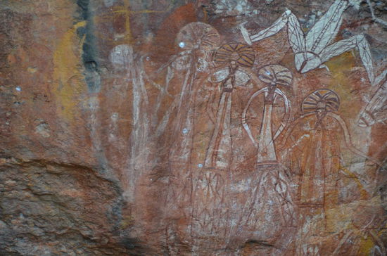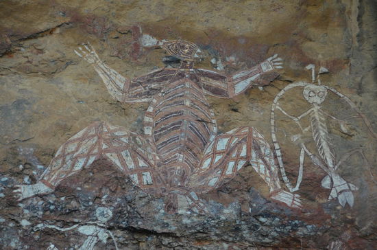 Der Name Nourlangie bezeichnet das Felsmassiv hier im Kakadu. Die Malerein befinden sich unter eindrücklichen Felsvorsprüngen und sind unglaublich gut erhalten. Das Alter schätzt man auf sagenhafte 20 000 Jahre. So lange gilt das Gebiet von Aborigines bewohnt.