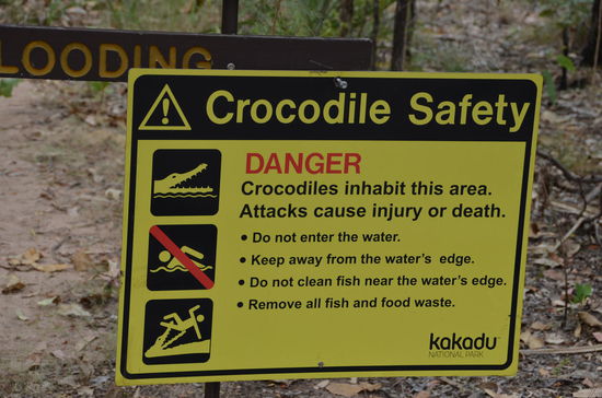 Ein breiterer Wanderweg führt uns dann durch die Wälder wieder hinunter zum Parkplatz. Die Karte zeigt uns noch einen weiteren Aussichtspunkt. Da wir grad trotz Fliegen, Mücken und Hitze gut drauf sind, entscheiden wir uns zu einem Besuch. Am Parkplatz beginnt auch ein Wanderweg zu einem bekannten Billabong. Ein Billabong ist übrigens ein Gewässer, das bei Regenzeit Wasser führt und bei Trockenheit ausgetrocknet ist. Da wir grad am Rande der Regenzeit sind, hat es selbstverständlich überall genügend Wasser. Sogar zu viel, denn ein Schild warnt vor einem Besuch. Es hätte durch das viele Wasser zu viele Krokodile. Na die möchten wir wirklich nicht in ihrer Ruhe stören...