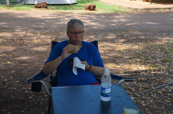 Jürg ist gespannt auf meine Erzählungen und ich schwärme ihm vor wie ruhig und schön der Flug war. Sein leicht skeptisches Gesicht zeigt, dass er nicht wirklich böse ist, dass er nicht mit musste. Zum Abendessen gibts Resten. Teigwaren mit Käse und Ketschup. Als es eindunkelt, löschen wir alle Lampen, denn die Millionen von Viecher, die wir sonst damit anziehen, sind widerlich. Auch im Camper krabbelt es. Nichts gefährliches aber kleine Fliegen nerven ebenfalls. Draussen ist es wie in einem Backofen und wir sind uns einig, dass die Tropen nie zu unseren Lieblingsgebieten werden. Ich versuche es mit einer kühlen Dusche. Doch selbst das Wasser ist nicht mehr kühl und kaum bin ich draussen, bin ich wieder genau so nass wie vorher. Wuäh!