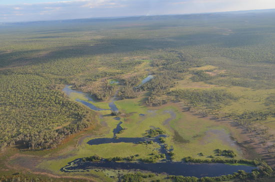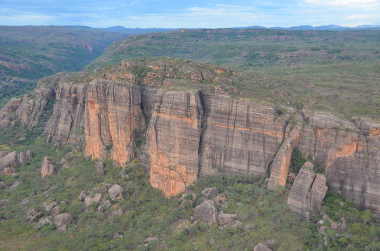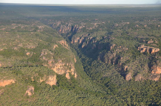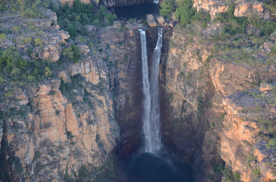 Wir fliegen lange über die Woodlands, erblicken viele malerische Billabongs und am Horizont eine langgezogene Bergkette, die in der Abendsonne leuchtet. Immer wieder durchbrechen Felsformationen die unendlichen Wälder. Dann erreichen wir den ersten Höhepunkt, die Jim Jim Falls. Wir befinden uns rund 60 Kilometer vom Kakadu Highway entfernt. Diese Wasserfälle sind nur mit Allrad-Fahrzeugen zu erreichen. Wegen dem hohen Wasserstand ist die Strasse aber zurzeit nicht befahrbar. Darum geniessen wir den Flug darüber. Der Wasserfall entsteht aus dem Jim Jim Creek und ist über 200 Meter hoch. In dem darunterliegenden See darf sogar gebadet werden, aber erst in der Trockenzeit wenn sich Ranger vergewissert haben, dass keine Krokodile mehr darin sind. Na, darauf würde ich mich nicht verlassen...