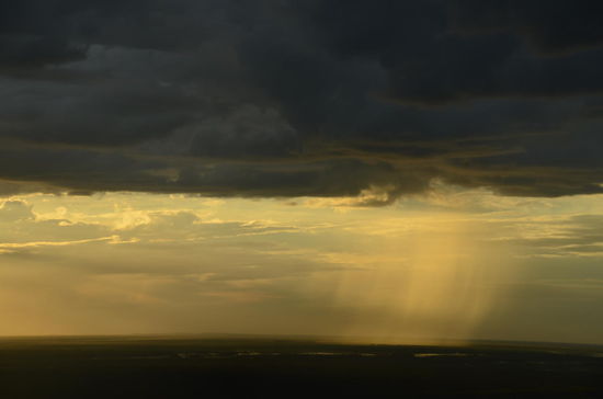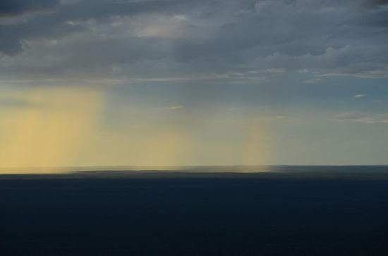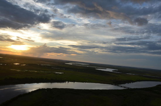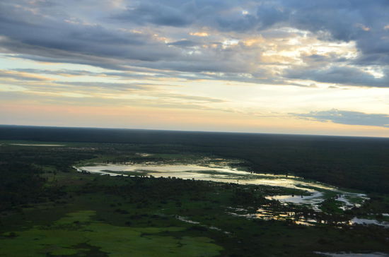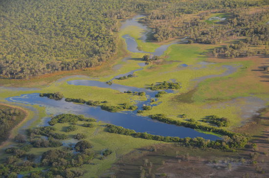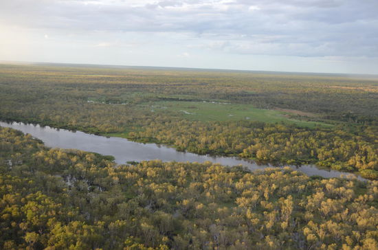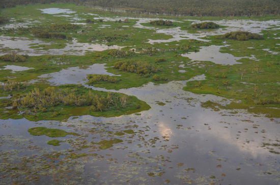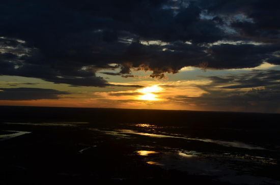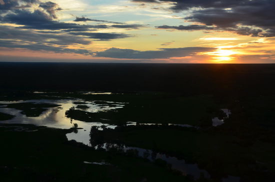 Wieder dreht der Pilot langsam ab und wir gelangen in die Wetlands, wo der riesige South Alligator River alles dominiert. Da die Regenzeit noch nicht wirklich vorbei ist, wirkt das Gebiet wie ein überdimensionaler See mit grünen Inseln. Am Horizont hat es dramatische Regenwände und die Abendsonne beleuchtet sie intensiv. Es ist wunderbar. Lange fliegen wir über die Wetlands und erblicken den Yellow River, den Fluss, den wir gestern mit dem Schiff befahren haben. Damit geht unser Flug langsam zu Ende und ein hinreissend schöner Sonnenuntergang begleitet uns.