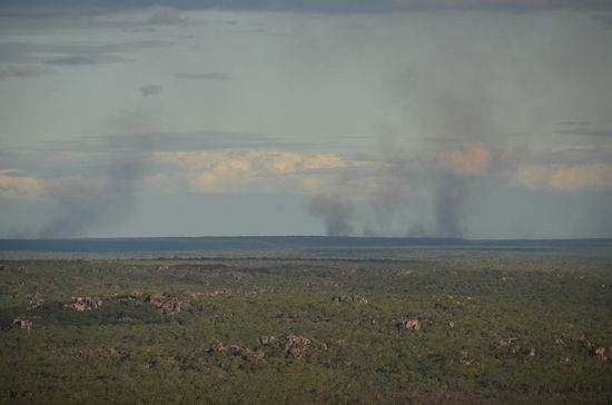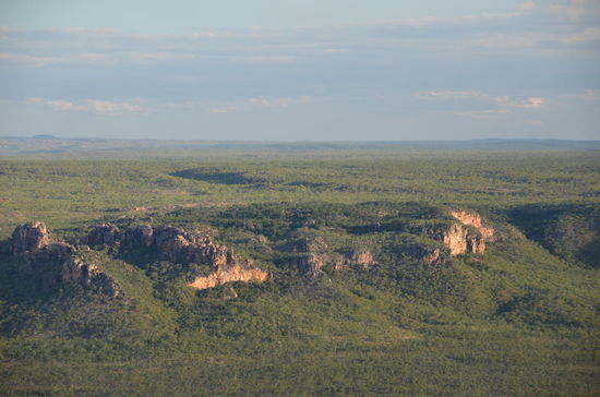 Langsam fliegt das Flugzeug nordwärts und wir erreichen die Felsengruppe des Nourlangie Rocks, wo wir heute morgen waren. An zwei Stellen steigen Rauchwolken auf. Buschbrände? Die Steinformationen sehen sehr eindrücklich aus und sind erst aus der Höhe in ihrer vollen Schönheit zu erkennen.