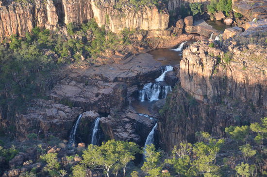 Der Pilot fliegt zwei spannende Kurven, damit die linken wie die rechten Passagiere einen schönen Blick für Fotos bekommen. Dann gehts zur nächsten eindrücklichen Schlucht zu den Twin Falls. Früher durfte man von der unbefestigten Strasse bis zum Wasserfall schwimmen, aber seit immer mehr auch in der Trockenzeit Salzwasserkrokodile gesichtet wurden, ist dies verboten. Ist wohl besser so... Wieder fliegt der Pilot eine Acht um die schönen Wasserfälle und wir geniessen den Ausblick und machen Fotos wie die Wilden.