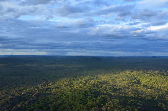 Wir wandern weiter dem Berg entlang und gelangen zu einem weiteren Felsvorsprung, wo wir weitere Malereien betrachten können. Der Wanderweg führt wieder in die Höhe. Da wir neugierig sind, ob wir wohl noch einen Aussichtspunkt erreichen, klettern wir munter über Felsen hinauf. Bis anhin hatten Bäume jegliche Aussicht verdeckt. Plötzlich erreichen wir eine Felsnase und haben einen tollen Blick über einen weiten Teil des Parks. Eine breite Busch- und Baumlandschaft erwartet uns eingerahmt von einem schönen Bergmassiv. Das gefällt uns!
