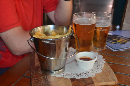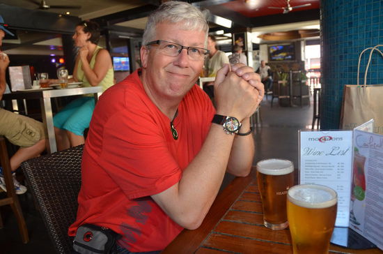 Wir begeben uns an die Mitchell Street. Jürg hat im Internet einen Rugby-Shop gefunden, der seine neuseeländische Lieblingsmarke Canterbury führt. Wir finden den Shop in einem Einkaufszentrum und so gibt es schon die ersten Einkäufe. Willkommen zurück in der Zivilisation! Wir sind hungrig. Es gibt viele Restaurants, die draussen nette Plätze anbieten. An einem schönen schattigen Platz geniessen wir einen australischen Lunch: Chips (hier Pommes Frites) und Bier.