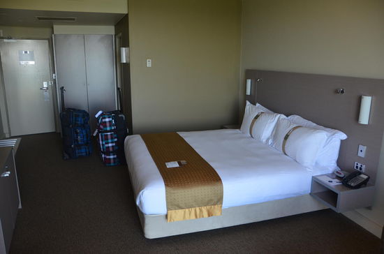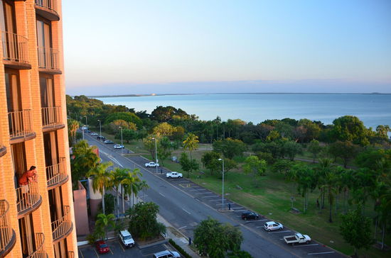 Es ist unglaublich heiss. So kehren wir zurück ins Hotel, wo wir nun unser Zimmer beziehen können. Der Ausblick im 8. Stock auf den Port Darwin ist wunderbar. Da es uns noch zu heiss ist um wieder mit der Citytour weiterzufahren, geniessen wir die Klimaanlage des Zimmers und schauen TV. Diese Annehmlichkeit ist zwar schön, haben das aber die letzten 32 Tage nicht vermisst.