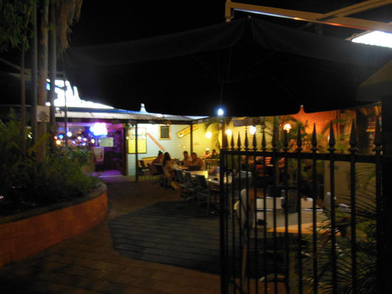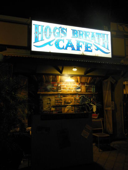 Zurück im Hotel relaxen wir ein wenig, dann am Abend kehren wir zurück an die Mitchell Street, wo wir ein Restaurant namens Hog's Breath sehen, das bescheiden die besten Steaks der Stadt anbietet. Hört sich gut an! Was draussen nach einem kleinen Restaurant aussah, entpuppt sich innen als ziemlich grossen und gut besetzten Laden.