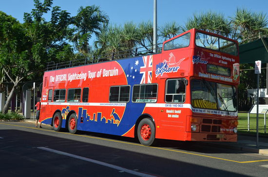 Gegen neun Uhr spazieren wir wieder die Mitchell Street hinunter zum Visitorcenter. An der Smith Street ist die Ausgangsstation unseres roten Busses. Dort können wir einen Pass kaufen und schon bald sitzen wir auf der Aussichtsplattform und lassen uns durch Darwin führen. Das Wetter meint es gut mit uns. Die Sonne scheint von einem wolkenlosen Himmel. Wie immer, wenn man nur eine begrenzte Zeit in einer Stadt ist, lernt man das Gesicht der City durch eine solche Bustour bestens kennen. Und so geniessen wir die anderthalb stündige Tour durch die verschiedenen Viertel der Stadt.