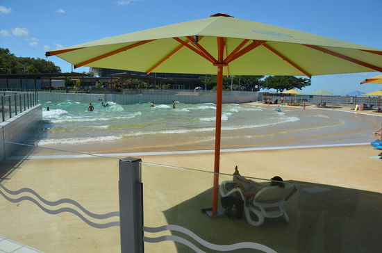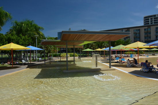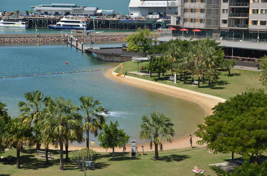 Als nächstes wollen wir an die Waterfront Lagoon. Da eine steile Klippe dort hinunter führt, hat man bequemerweise eine Brücke über den Kitchener Drive gebaut und ein Lift bringt einem dann hinunter auf Meereshöhe. Darwin hat zwei kleinere Probleme: keinen Strand mit schönen Wellen und im Wasser gefährliche Marine Stringers! Damit man trotzdem nett baden kann, gibt es hier unten ein tolles Wellenbad und eine geschützte Lagune. Das gefällt uns. Lange sitzen wir am Wellenbad, geniessen ein Eis und schauen den Leuten zu, die begeistert in den Wellen schwimmen.