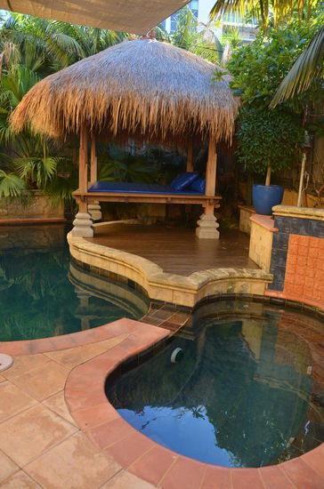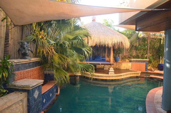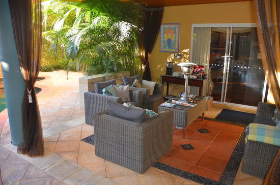 Wir begeben uns zum Frühstück. Obwohl in diesem B&B rund 10 Leute sein sollen, sind wir die einzigen. Das Continental Frühstück ist schon aufgetischt und um halb neun erhalten wir auch noch warme Eierspeisen. Das Haus ist wirklich wunderschön. Es hat einen offenen Innenraum mit Rattanmöbeln und einem beeindruckenden Pool. Hinter dem Pool hat es eine Hawaii-artige Liege mit Strohdach. Der grosse Frühstückstisch befindet sich gleich vor dem Pool mit einer Bar, wo sich das ganze Buffet befindet. Alles schmeckt äusserst lecker!