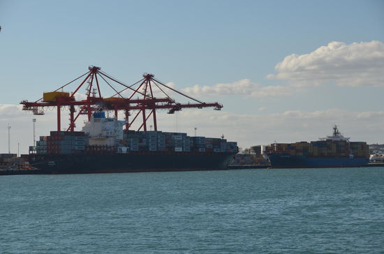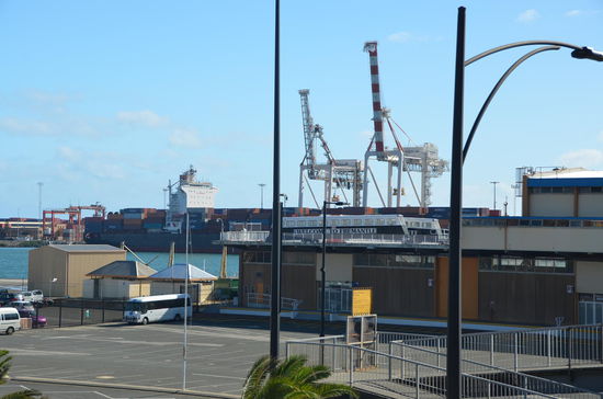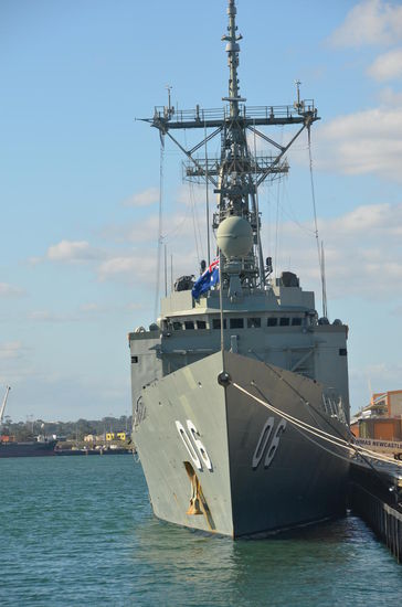 Rechterhand erblicken wir den Inner Harbour. Über eine Eisenbahnbrücke gelangen wir ein wenig näher an den Kanal und können mehrere grössere Frachtschiffe sehen. Doch weiter gehts nicht. Also fahren wir die Philimore Street hinunter zum Fremantle Port Authority Gebäude und parken unser Auto auf dem grossen Parkplatz. Endlich können wir ganz an den Kanal. Leider ist nicht sonderlich viel los. Weder grosse Fracht- noch Kreuzfahrtschiffe sind vor Anker. Eine kleine Fregatte der australischen Armee ist an der Mole und auf der gegenüberliegenden Seite zwei Containerschiffe. Jürg ist begeistert.
