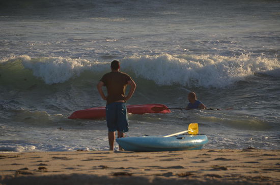 Es ist ziemlich kalt geworden, so dass wir unsere warmen Fleecejacken tragen. Hohe Wellen schlagen lautstark an den Strand und Freunde der wilden Wellen sind mit Surf- oder Kitebrett nach Scarborough gekommen um dies auszunützen. Lange sitzen wir am Strand und beobachten die Wilden, die auf ihren Brettern eindrückliche Kunststücke zeigen. Immer wieder lassen sich die Surfer durch Wellen und Wind in die Luft spicken. Manchmal gelingt die Landung, manchmal halt auch nicht.