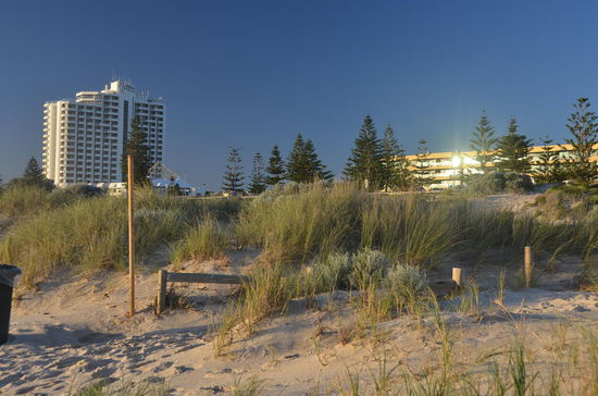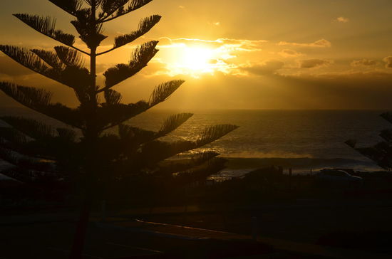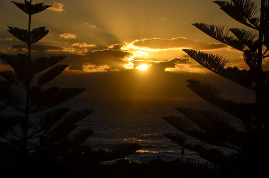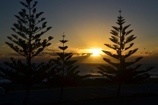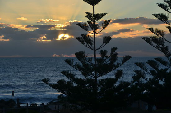 Wir spazieren nordwärts weiter dem Strand entlang und gelangen zum Kreisel der Scarborough Beach Road. Dort entdecken wir einen Liquorstore. Doch leider haben wir unsere Geldbörse vergessen. Jürg kehrt zum B&B zurück. Ich geniesse derweilen den Sonnenuntergang hinter meinen Lieblingsbäumen, den Northfolk Pines. Es entstehen wunderschöne und stimmungsvolle Fotos auch wenn die Sonne irgendwann hinter einer Wolkenwand verschwindet.