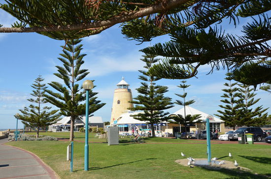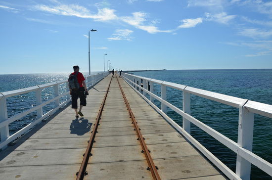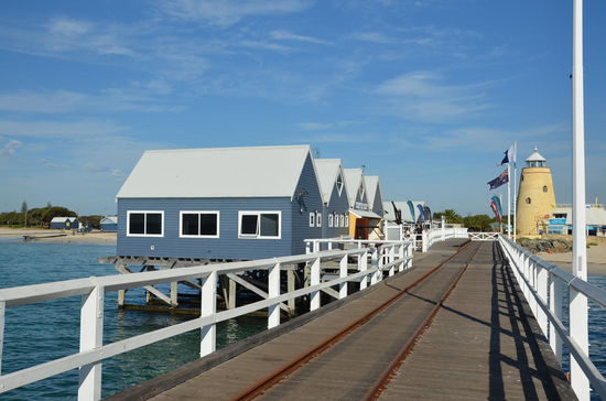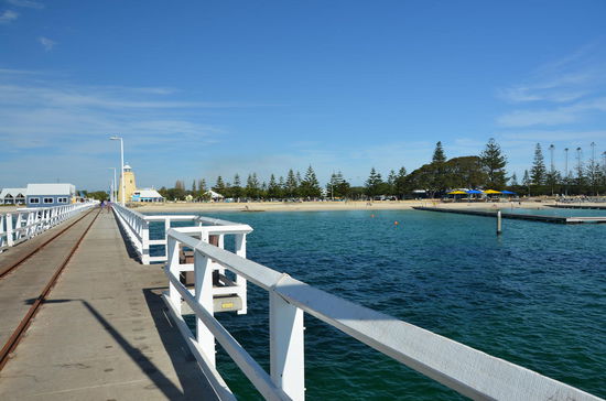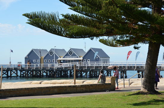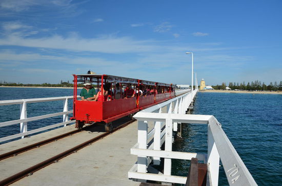 Der Jetty ist die grosse Attraktion von Busselton. 1853 - 1865 wurde die knapp 2 Kilometer lange Anlegestelle in Holzbauweise gebaut, weil ein seichter Küstenstreifen mit Untiefen das Anlegen von Schiffen und Wasserflugzeuge erschwerte. Heute ist es eine beliebte Touristenattraktion mit einem kleinen Zug, der fussmüde Touristen hinaus zum kleinen Unterwasserobservatorium führt.
