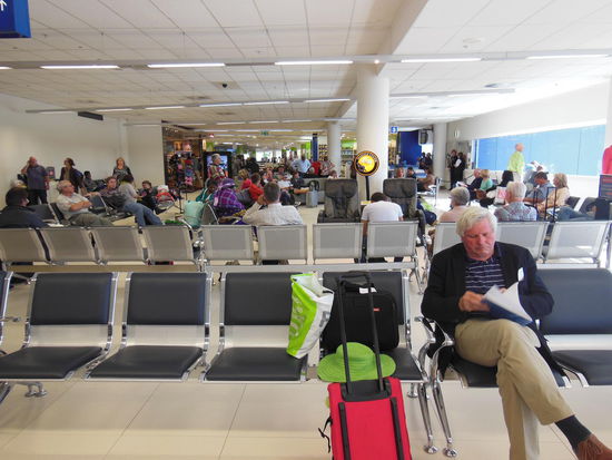 Also kehre ich zu Jürg zurück, laden das Auto aus und kehren zum Terminal zurück, wo wir Schlüssel und Navi abgeben. Die Schalter der Singapore Airlines sind noch geschlossen. So stehen wir mal an. Ich bin riesig durstig und mache mich auf die Suche nach Getränken. Nach kurzer Wartezeit öffnet der Schalter und wir können einchecken. Wir erkundigen uns, ob wir bis Singapore Exit-Plätze bekommen könnten. Die nette Dame bejaht dies. Sie müsse uns aber die Boardkarten noch mit unseren alten Plätzen ausstellen. Ich begreife es zwar nicht ganz, aber wir belassen es mal dabei. Vor der Sicherheitskontrolle müssen wir noch ein Ausreiseformular ausfüllen und dann gehts recht flüssig durch die Kontrollen.
