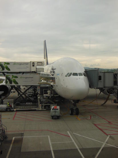 Der 5 1/2 stündige Flug wird sehr angenehm. Filme schauen, Essen geniessen und schon bald landen wir um viertel nach Acht abends in Singapore. Ein starkes Gewitter zieht über die City und wir sehen überall Blitze, die mitten in die Stadt einschlagen. Doch der Landeanflug wird dadurch nicht gross behindert.