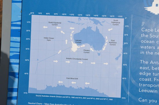 Wir spazieren zum eindrucksvollen Leuchtturm. Der Mix aus Wolken und Sonne lässt eine magische und fotogene Stimmung entstehen. An einem Aussichtspunkt setzen wir uns auf ein Bänkli und geniessen den Blick auf die grossen Wellenkämme, die unermüdlich in die Bucht rollen und an Felsen tosend brechen. Auf der nördlichen Seite des Leuchtturms finden wir Informationstafeln, die die spannenden Strömungen zeigen, die rund ums Cape Leeuwin herrschen und hier aufeinander prallen. Das dies eine grosser Herausforderung für Seekapitäne bedeutet, können sogar wir Landeier erkennen.