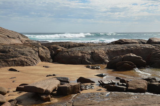 Gestärkt kehren wir zum Camper zurück und fahren über eine Holperpiste hinunter an einen nördlichen Strand. Kleine Pfützen, die von der Flut zurückgelassen wurden, beherben kleine Meeresbewohner wie farbenfrohe Krabben. Daneben kann man wunderbar auf den Felsen herumkraxeln und bis zur tosenden See gelangen. Die Wellen brechen sich daran lautstark und man muss schon ein Auge darauf haben, wo man hingeht. Die Brandung ist unberechenbar. Lange sitzen wir hier und geniessen den Sonnenschein, die 20 Grad und der starke Seewind. Ein wunderbarer Ort!