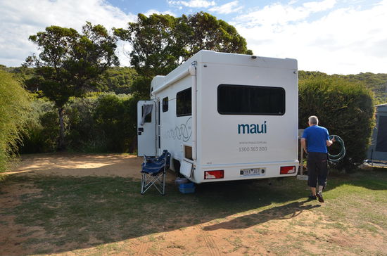 Mit dem Camper verlassen wir Cape Leeuwin und kehren zurück nach Augusta. Bevor das Städtchen beginnt, biegen wir rechterhand zum Flinders Bay Caravan Park ab und erhalten einen schönen Platz für unser Gefährt. Jeder Campingplatz ist von einer gepflegten hohen Hecke umgeben, so dass die Privatsphäre gewahrt ist. Das Stellen des Campers funktioniert schon hervorragend, so dass wir schon bald die Umgebung erkunden können.