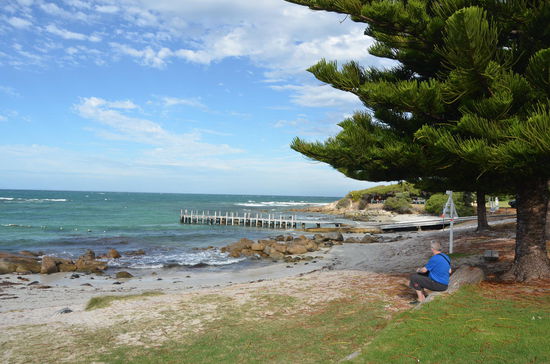 Zwei hölzerne Stege markieren den wohl ungefährlichen Teil der Bucht und tatsächlich springen ein paar Mutige von einem der Stege schwungvoll ins - wohl recht kühle - Wasser. Wir setzen uns auf einen Holzstamm und geniessen den Ausblick. Was für ein schöner Ort. Hinter uns befindet sich ein grosser Parkplatz mit Spielplatz und drumherum viele schöne Ferienhäuser. Hier würde es mir auch gefallen. Sicher nicht grad das grösste Badeparadies Australiens, aber eine unglaublich malerische Gegend!