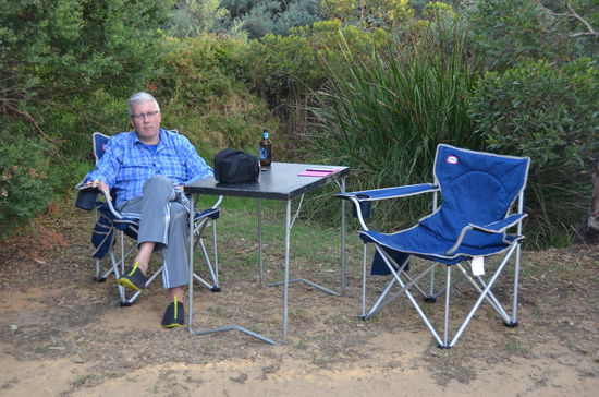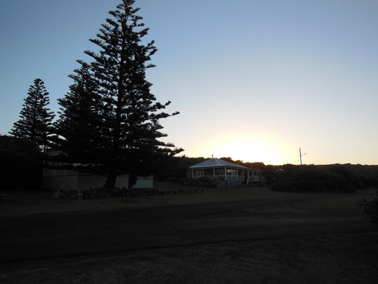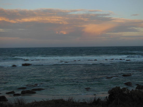 Wir kehren zurück in den Caravan Park und machen es uns neben unserem Camper bequem. Wir geniessen ein Apéro und lesen in unseren Büchern. Da der Boden teilweise aus Sand besteht und nach wie vor ein starker Wind weht, werden wir bei einer entsprechenden Böe des öftern eingenebelt. Die Sonne geht um fünf Uhr bereits langsam dem Horizont zu und uns überfällt die Müdigkeit. So spazieren wir ein zweites Mal hinunter zur schönen Flinders Bay und finden einen Aussichtspunkt mit Bänkli. Da wir hier ostwärts blicken, sehen wir zwar keinen Sonnuntergang, aber schöne Gewitterwolken, die sich über dem Meer in rosa Schattierungen färben.