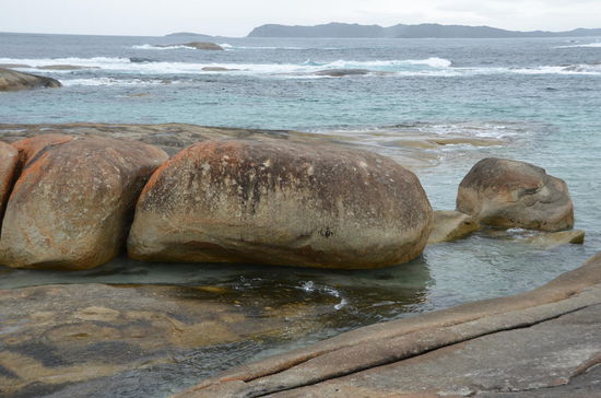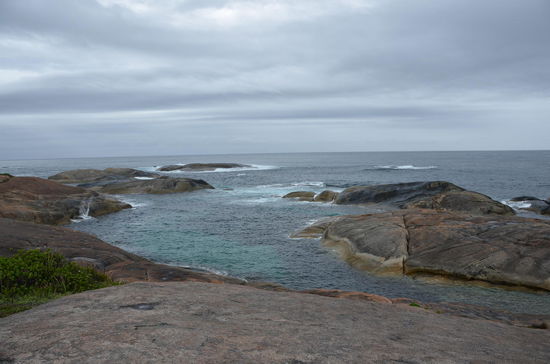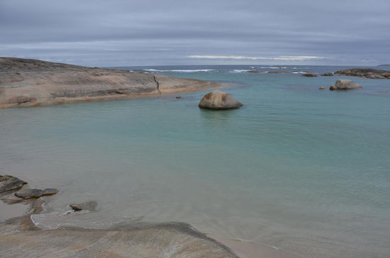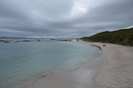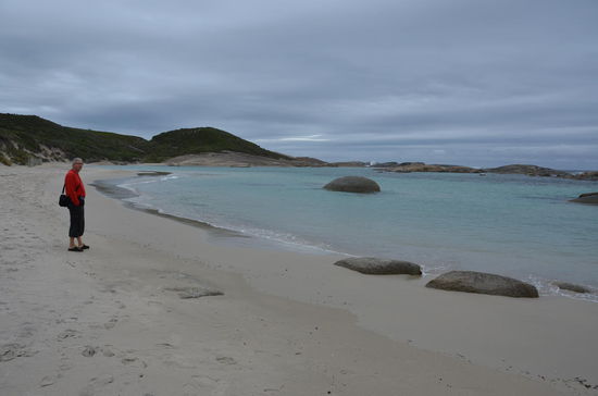 Die heutige Fahrt führt uns weiter ostwärts bis kurz vor Denmark. Hier biegen wir zum populären William Bay Nationalpark ab. Im Reiseführer und im Internet haben wir von diesem Park sensationelle Bilder einer Küste gesehen, die in der Farbenpracht kaum zu übertreffen ist. Doch das bewölkte und regnerische Wetter macht uns einen Strich durch die Rechnung. Immerhin schliesst Petrus grad mal die Schleusen für einen ausgedehnten Spaziergang am Strand und die verschiedenen Schattierungen der Bucht lassen erahnen, welche Pracht sich hier bei Sonnenschein bietet.