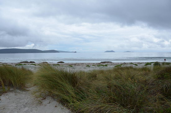 Wir befinden uns am King George Sound, einer geschützten Bucht mit sanften Wellen. Draussen erblicken wir zwei Inseln und einen grossen Tanker, der wohl darauf wartet beladen zu werden. Das Wasser ist ziemlich kalt, niemand badet, aber wie wir spazieren viele Leute den breiten Strand hinauf und hinab.