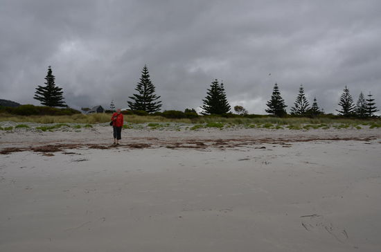 Nach weiteren Besuchen in obligaten Surfshops kehren wir zurück zu unserem Camper und fahren um den Mount Clarence herum zum Middleton Beach zu unserem heutigen Holidaypark. Wir erhalten einen schönen Platz direkt hinter einer hohen Düne mit Strandzugang und mit einem eigenen Badehäuschen. Alles wäre wunderschön, würden die schwarzen Wolken nicht so tief herunterhängen und alles in Düsternis versinken lassen. Da es um sechs Uhr schon wieder stockdunkel sein wird, begebe ich mich zur Rezeption, wo man sich Filme ausleihen kann. Unser Camper hat nämlich einen TV mit DVD-Player. Und so kehre ich mit "Ted" zu Jürg zurück. Da es grad nicht regnet, machen wir uns zu einem Strandspaziergang auf. In den Büschen entdecken wir ein eigenartiges Tier, vermutlich ein Beuteltier, das wie eine zu gross geratene Ratte aussieht. Echt niedlich, doch sehr kamerascheu. Man setzt sich zwar nett hin, nagt an irgendwelchen Gräsern und sobald die Kamera auf Position ist, flitzt man unter den nächsten Busch. Sehr nett...