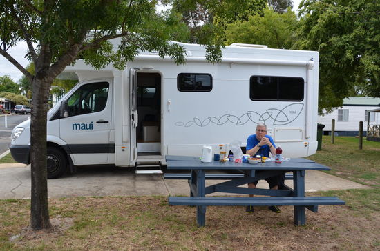 Der Pinnacle Caravan Park liegt malerisch nur etwa hundert Meter vom Strand entfernt. Wie so viele Caravan Parks haben auch hier viele permanente Camper ihre Festplätze, gut zu erkennen am Puff ums ganze Häuschen. Man hat dann wirklich all seine Spielzeuge bei sich von Boot bis Fahrrad, vom grossen Barbequegrill bis Fernsehgerät. Daneben hat es dann Plätze für Touristen wie uns und wie so üblich, werden wir beim Einparken von neugierigen Augen beobachtet. Man möchte ja wissen, was für komische Käuze sich da wieder einnisten.