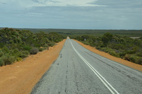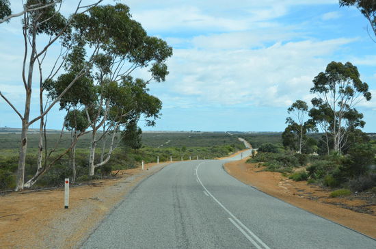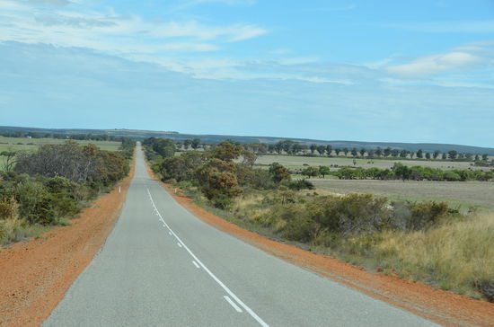 Langsam verlassen wir das zivilisierte Gebiet und gelangen in eine landwirtschaftlich dominierte Gegend mit vielen Schaf- und Kuhfarmen. Auch diese endet irgendwann und wir fahren durch eine Weite, die von Feldern, hohen Eukalyptusbäumen und zahlreichen Sträuchern gesäumt ist. Oftmals verläuft der Highway schnurgerade und Hügelzüge lassen uns achterbahnartig rauf und runter fahren.