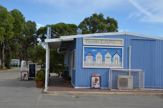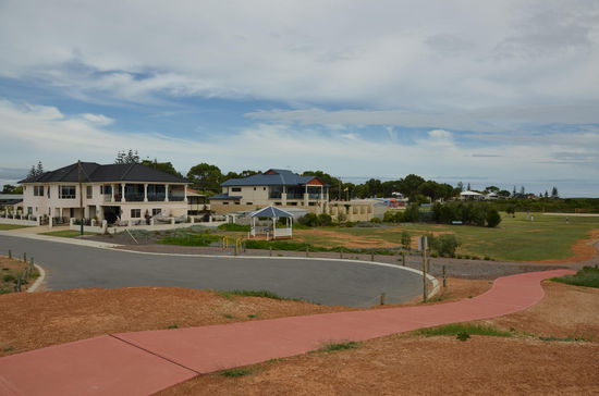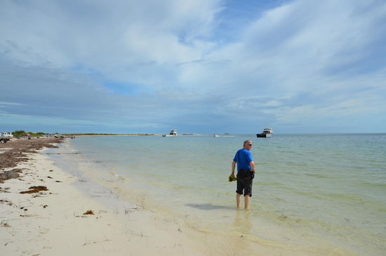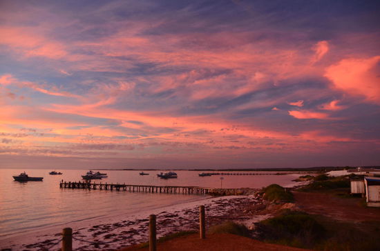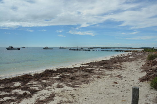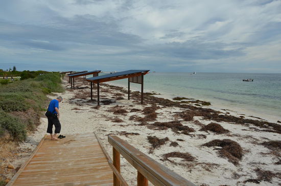 Der schöne Nachmittag lädt zu einem Spaziergang ein. Die Rezeption des Campingplatzes besteht auch aus einem kleinen Laden und einem Restaurant. Wir kaufen uns Eiscrème und spazieren hinunter an den Strand. Dort erblicken wir nördlich wunderschöne Ferienhäuser und teure Villen. Im Hafen sieht man viele Fischerboote. Dank einem Mix aus Wolken und Sonne hat das ruhige Meer eine wunderbare hellgrüne und bläuliche Färbung, auch ist das Wasser ein wenig wärmer als südlich von Perth. Die Sonne brennt schon recht heiss hinab und es wird angenehm kühler sobald sie hinter Wolken verschwindet.