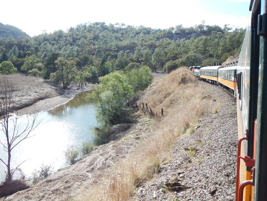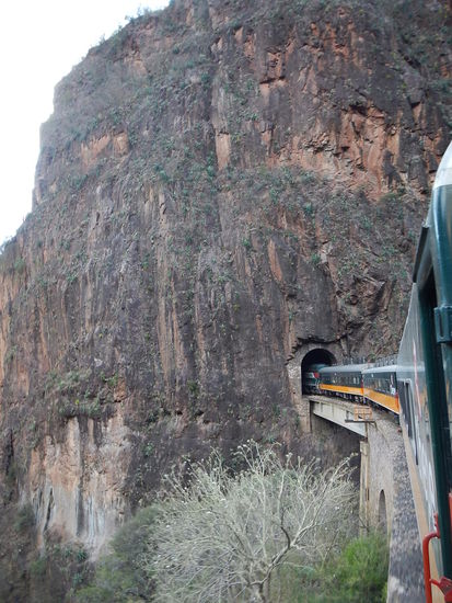 Meine Reise fängt in Divisadero an wo ich noch mal einen Blick über die Barrancas del Cobre werfe, traumhaft. Dann geht es los, Tickets kauft man hier noch im Zug. Von hier schlängelt sich die Strecke durch die zerklüfteten Felsen der Sierra Madre Occidental/Sierra Tarahumara, wobei man in schwindelerregend tiefe Schluchten und auf bizarre Felsformationen sehen kann. Die 628km lange Strecke wurde 1961 eröffnet, führt über 39 Brücken durch 87 Tunnels und bewältigt einen Höhenunterschied von 2400 m . Während der gut 14 stündigen Reise durchfährt der Zug verschiedene Landschafts- und Vegetationsformen, von der kühlen Bergregion über Kakteensteppen bis zur Pazifikküste mit ihrem subtropischen Klima.