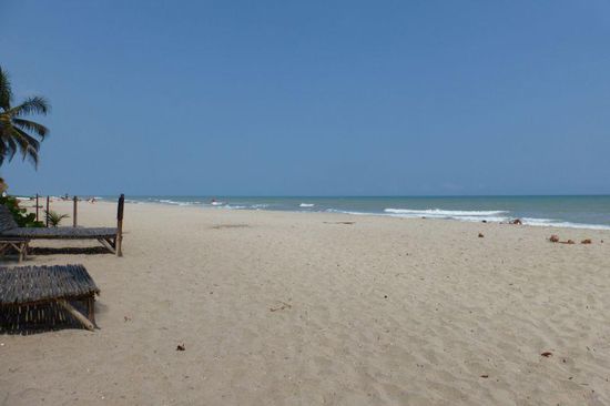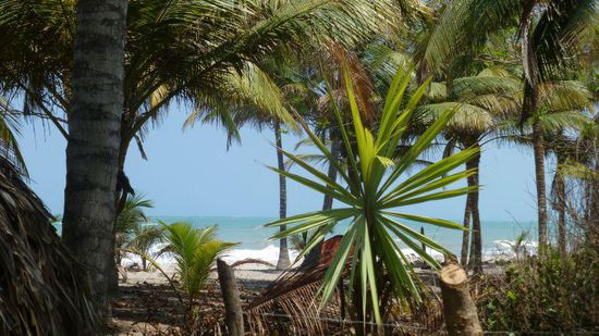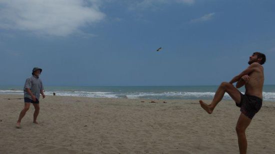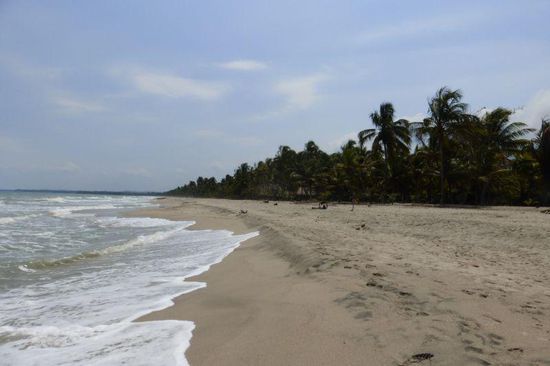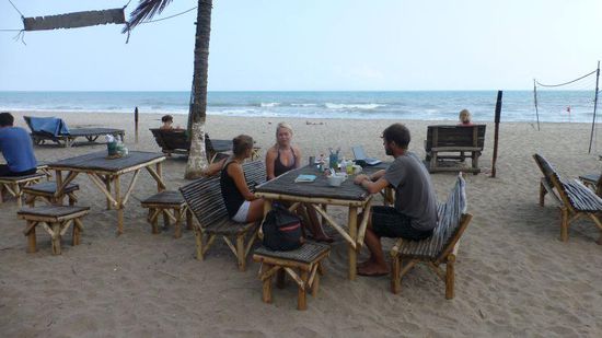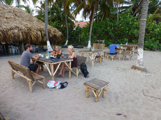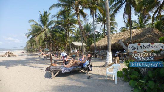 Sie liegt direkt am Strand unter Palmen, es gibt Meer, Sonne, Strand, Palmen, Kokosnüsse, gutes Essen - Pescado, camarones, langostinos etc.) - happy hour, Cocteles (=Cocktails). Vier Tage tun wir wenig bis gar nichts, treffen viele interessante Leute, Australier, ein amerikanisches Paar aus Oregon, die mit ein Jahr lang mit zwei Geländemaschinen und einem großen Hund unterwegs sind und für ihn ein spezielles Lager auf dem Motorrad haben.