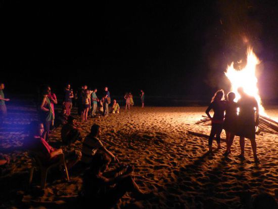 Es finden sich erstaunlich viele Leute ein, ein großes Feuer wird entzündet, alle sitzen am Strand. Wir halten nicht bis zum Ende durch, denn Nichtstun macht müde.