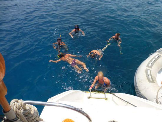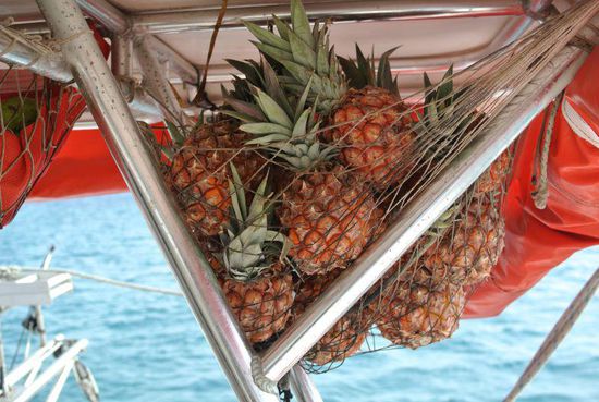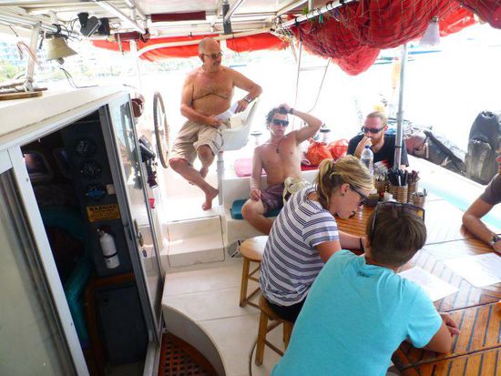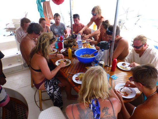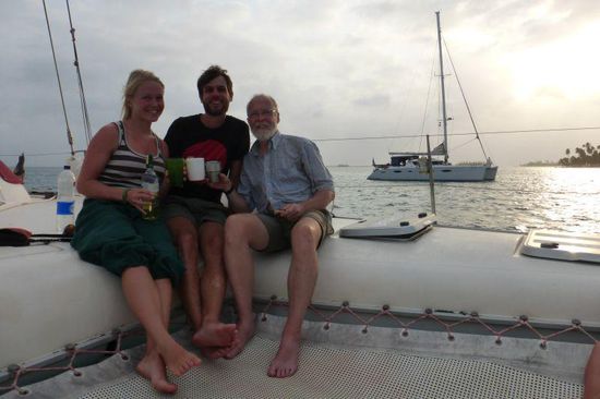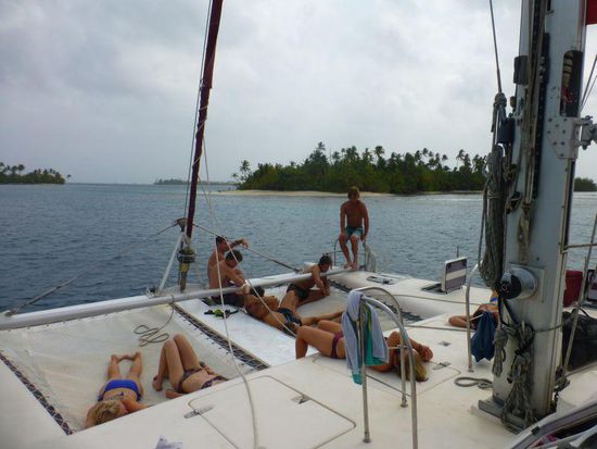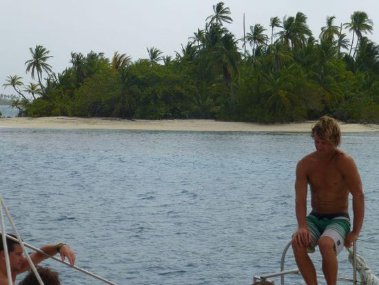 Wir ankern in ruhigen Gewässern, können baden, an den Riffen schnorcheln, zu Inseln rüberschwimmen und einfach nur relaxen! Es gibt immer gekühlte Limonade, und an den vielen Kg Früchten (Bananen, Ananas, Mango, Papaya, Limetten) können wir uns nach Belieben selbst bedienen. In den Aussies haben wir uns übrigens schwer getäuscht, sie sind ganz nett und sehr ruhig, sie beschränken sich auf Schlafen, Essen, Baden und Filme gucken auf dem Laptop. Dafür mischen die 2 Neuseeländerinnen abends die Gesellschaft ordentlich auf, sie haben zu zweit 38 Dosen Bier dabei und einige Tetrapaks Wein und es gibt Dosenstechen und Trichtertrinken, den Javier organisiert hat, vermutlich füllt er damit sonst Öl. So kann mag sich täuschen.